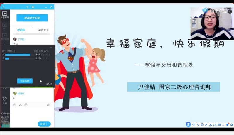 2月8日下午,由校党委学生工作部主办,76net必赢线路检测中心、机械工程学院及莳心工作室承办的 “寒假与父母和谐相处”专题心理讲座在腾讯课堂举办,旨在引导广大学生在寒假能更好地与父母和谐相处,感受家庭的温暖与幸...