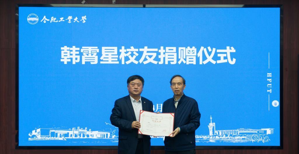 4月27日下午,韩霄星校友捐赠仪式在屯溪路校区举行。校党委书记余其俊,校党委副书记、校友总会常务副会长陈刚出席捐赠仪式。深圳百山创业投资有限公司董事长、农机系农机专业77级校友韩霄星深情回顾了在学校的学习和工作时光以及捐资设立“剑中奖学金”的目的。他表示母校勤奋努力的求学氛围、开拓进取的创新精神、感恩奉献的行事准则深深地影响着他的一生。祝福母校明天更辉煌,人才辈出代代强。捐赠仪式上,余其俊向韩霄星校...