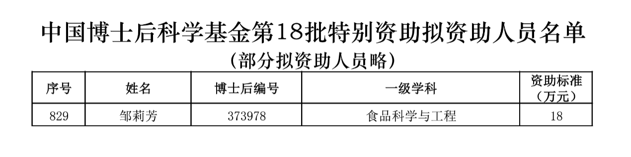 近日,中国博士后科学基金会公布了《关于对2025年度中国博士后科学基金第18批特别资助拟资助人员名单进行公示的通知》(中博基字〔2025〕2号),全国共1200人入选,其中食品科学与工程专业入选21人。我院博士后邹莉芳(合作导师:徐宝才 教授)获批资助,资助标准为18万元/人,实现了在博士后特别资助项目上的新突破。博士后是我院学科建设的重要人才队伍。学院领导高度重视博士后队伍建设,持续加强政策支持与条件保障,在站博...