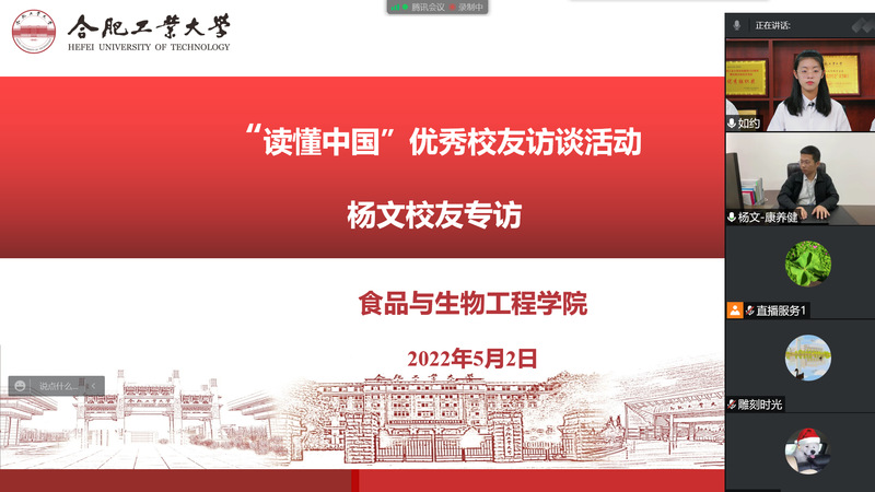 杨文校友从自身的创业历程出发,用生动的故事讲述了自己大学生活、创业经历以及基层贡献的励志事迹。杨文校友是我校食品科学与工程专业本科生及研究生,在校期间作为主要参研人员参与完成国家重点科研项目,还曾担任学院学生会主席、团支部书记、党支部书记等,毕业时被授予安徽省优秀毕业生荣誉称号。毕业后杨文校友放弃了上海的高薪工作,毅然决定回北川创业,利用北川在中医药方面的资源优势,带动当地百姓脱贫致富,为当地兴村振兴奉献了自己的一份力量。杨文校友寄语我院学子能够继续坚持和发扬优良传统,学好专业知识,提升综合素质,将来更好地服务国家和社会。
