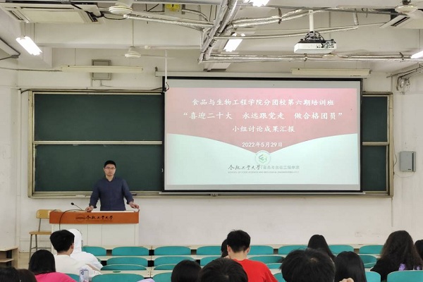 5月29日上午,76net必赢线路检测中心分团校第六期培训班于翡翠湖校区9教101开展“喜迎二十大 永远跟党走 做合格团员”小组讨论成果汇报。学院分团校班主任万代林和全体学员共同参加。