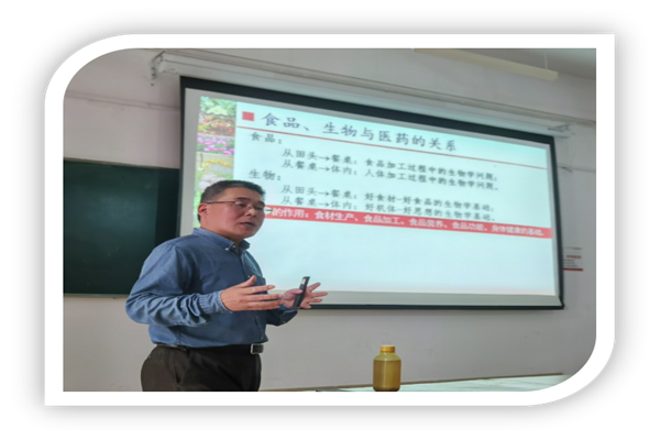 接着罗教授引出了这次讲座的核心——“食品、生物、医药的关系”。教授解释说,“物质的人”需要食品来提供营养,在人体内产生生物学变化,从而达到“思想的人”——用知识来提升自己的品质。食品的“食”正是由“良”和“人”组成,这说明一个健康的人离不开好的食品和好的生物学变化。最后,罗教授介绍了与霍山石斛有关的三个实验,并讲解石斛的诸多功效。