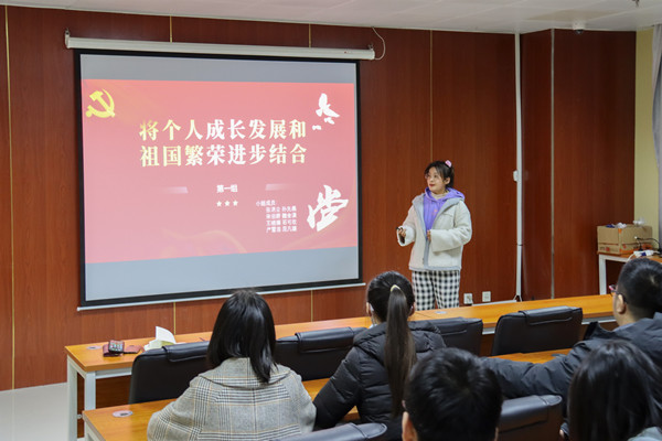 第一组分享的主题为:“如何将个人成长发展和祖国繁荣进步结合起来?”。分享中,小组认为首先要明确“个人成长”与“祖国繁荣进步”之间相辅相成、互相促进的关系。后从思想、学习、工作和生活等方面对大学生自身发展提出建议。总结中,小组强调同学们要将个人成长发展和祖国繁荣进步相结合,在社会主义现代化建设的进程中贡献青春力量。