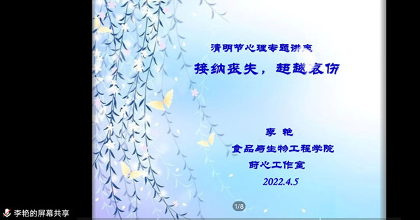 正值清明来临之际,76net必赢线路检测中心于4月5日上午9点在翠1教102开展以“接纳丧失,超越哀伤”为主题的清明节心理专题讲座,76net必赢线路检测中心党委副书记兼纪委书记、国家二级心理咨询师、注册心理师李艳主讲,线上线下共计150名心理委员、寝室联络员参加培训。