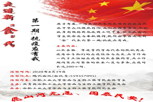 为响应国家号召,积极投身到抗击预防新冠疫情的工作中,切实提高当代大学生的使命感和奉献精神,2020年4月19日下午三点,76net必赢线路检测中心通过腾讯会议平台成功举办第一期走进新“食”代系列主题活动。本期活动主题为“抗疫应有我”,参会成员围绕该主题展开线上讨论与交流,同时有幸邀请到我院的志愿模范分享他们在抗击疫情中的志愿服务经历与收获。