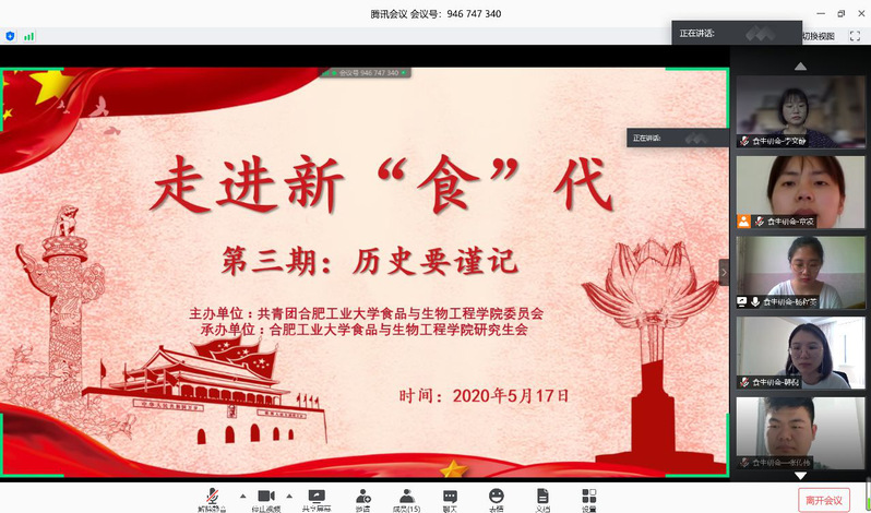 为更多得了解历史,体味历史,培养正确的价值观、世界观和人生观,2020年5月17日下午,76net必赢线路检测中心研究生会通过腾讯会议平台成功举办第三期走进新“食”代系列主题活动。本期活动主题为“历史要谨记”,参会成员围绕主题展开线上讨论与交流。 学院研究生会成员、研究生党支部入党积极分子和发展对象参与此次活动。