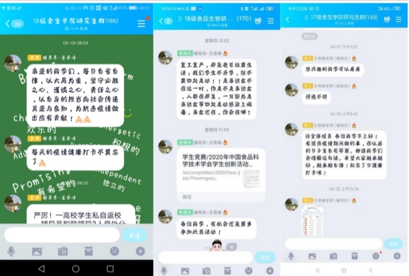 自疫情发生以来,学院通过 QQ 群、微信公众号积极传达中央文件精神,发布疫情防控倡议书,向全院师生普及疫情防治知识,全面统计师生情况,实时更新,及时上报;辅导员严格执行学院要求,通过班级群向每一位同学传达各项通知,做到人人阅读,及时反馈,并通过“今日校园”软件按时发布疫情报表,叮嘱学生完成每日健康打卡,减少外出;研究生会骨干成员通过微信公众号平台定期发布“防疫安全播报”,自 1 月 27 日发布“防疫安全播报第一弹”以来,截至今日已播报 50余次,总浏览量高达 9900 余次,日均浏览量达 195 次,涉及国际疫情、全国疫情、安徽疫情、武汉疫情、合肥复工复学、bwin必赢线路检测最新通知等多个版块内容,为食生学院的学子搭建一座了解疫情的“云桥梁”。研究生会同时在线上开展征集祝福语“为武汉祈福”、“抗疫有我”征文、“分享考研复试心得”、组织观看“消防直播”等活动,鼓励居家的我们停课不停学,齐心渡难关。