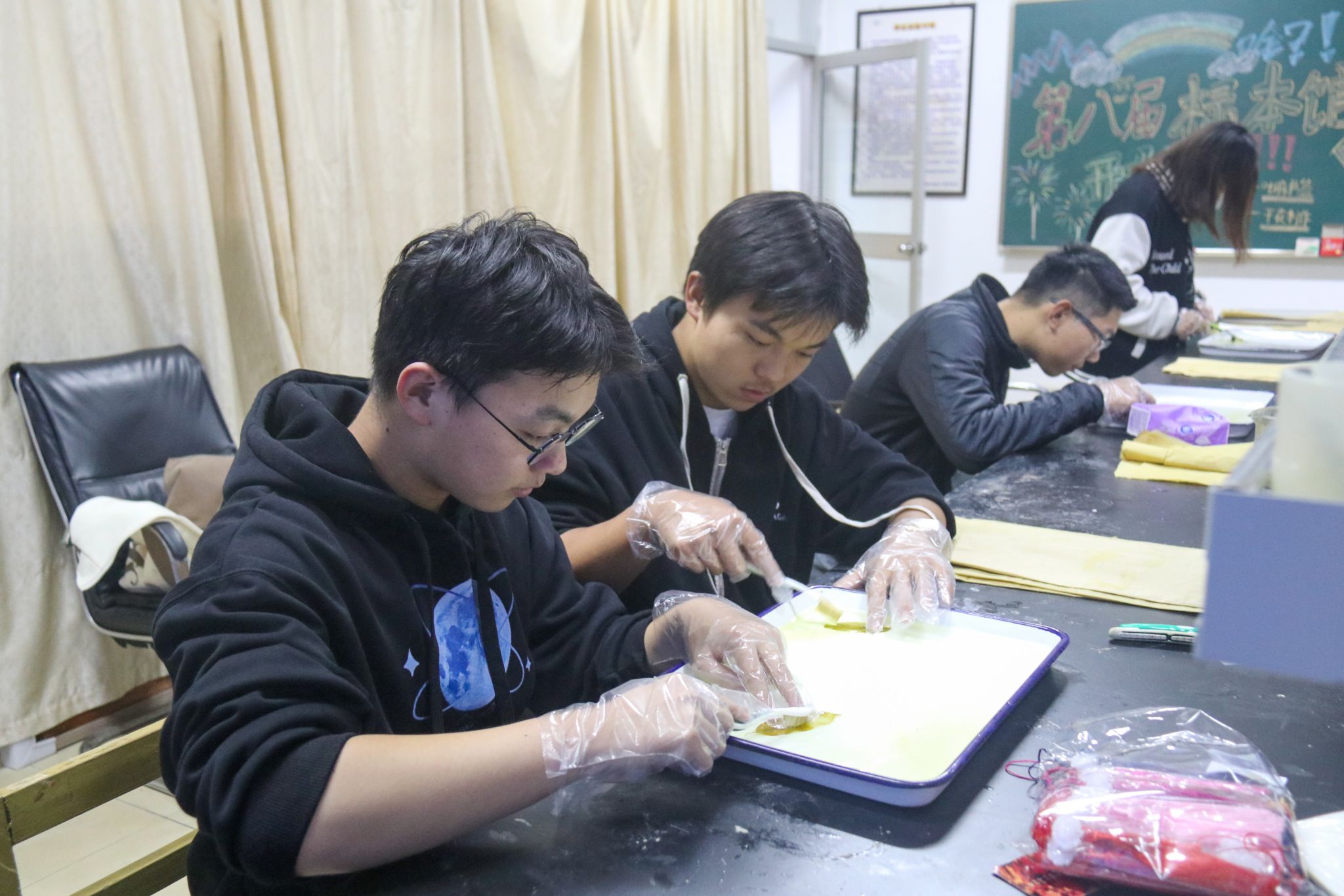 活动举办前,学院在翡翠湖校区第一、第三食堂门前广场进行了线下宣传,现场摆放的生物标本引起广大同学的浓厚兴趣和广泛关注。生物标本馆位于翡翠湖校区一食堂楼下,分为“生物标本科普展厅”和“叶脉书签制作体验厅”。参观中,讲解员耐心细致地为前来参观的同学们科普了生命标本制作的相关理论知识,详细介绍了馆类所展示的动物、植物以及创意标本的收藏情况以及生命标本制作过程背后的故事。一件件保存完好的生物标本,以及由标本照片制成的趣味拼图,使同学们在乐趣中对生命科学有了更深的了解。在叶脉书签制作体验厅,同学们体验了用树叶制作工艺品的方法,锻炼了动手能力。