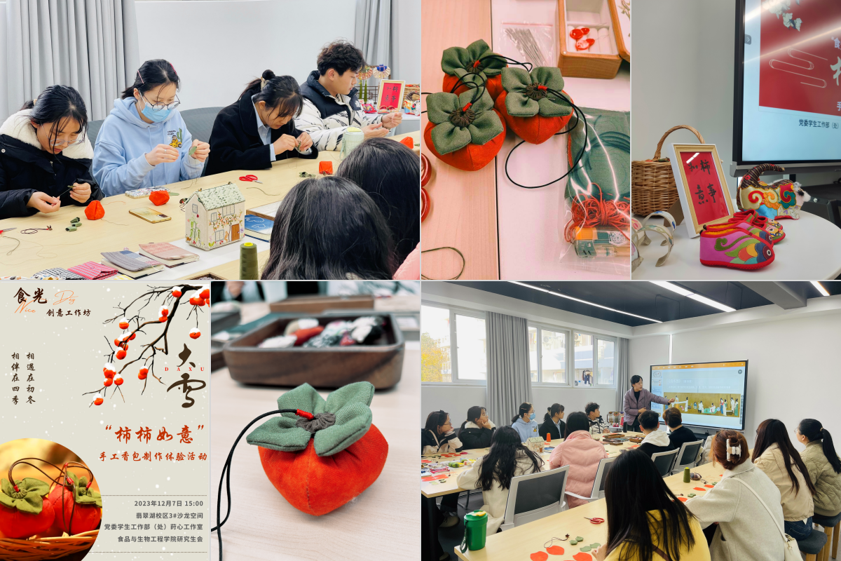 大雪渐寒,岁暮清欢;愿好“柿”发生,“柿柿”圆满。此次活动进一步传承传统佩饰香包的技艺和文化,有效增强了广大研究生学生的获得感、成就感、幸福感,掌握了必备的劳动技能,让爱美之人发现美、创造美,提高审美能力,展示青春活力。