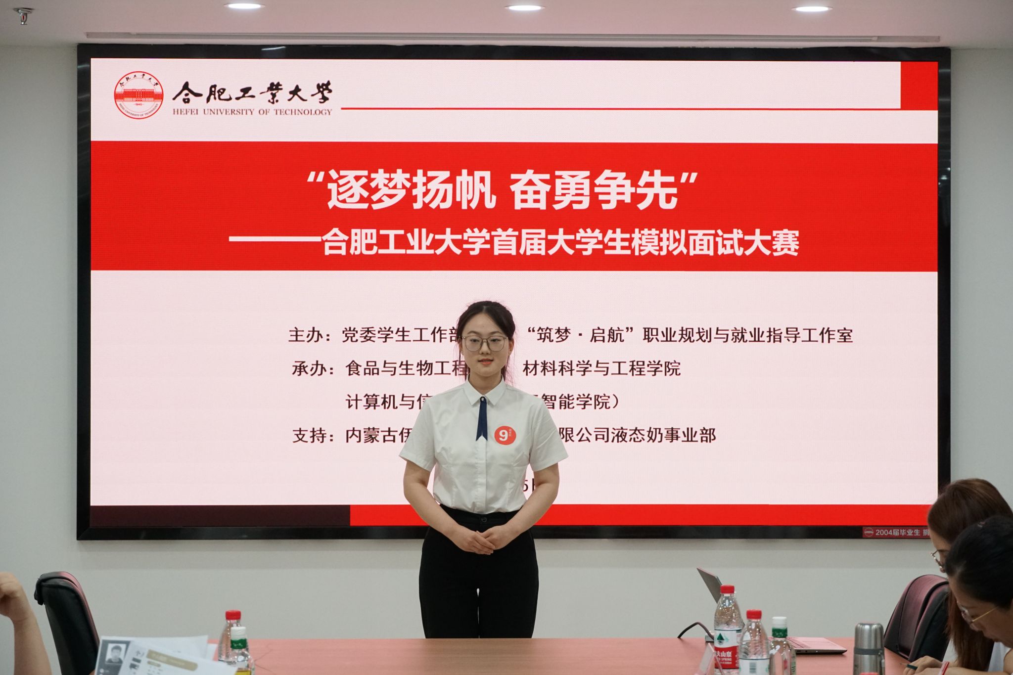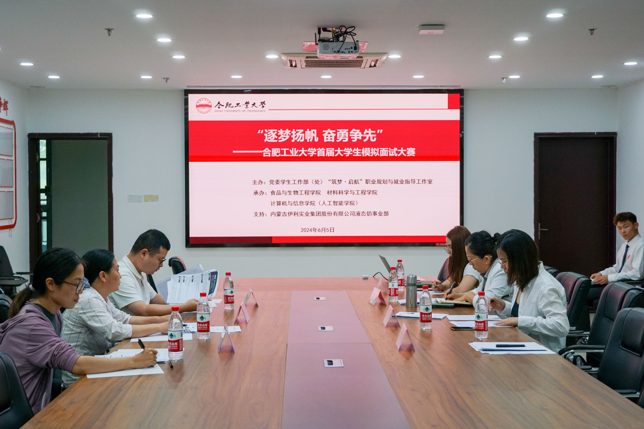 6月5日下午,我校“逐梦杨帆,奋勇争先”首届大学生模拟面试大赛在食生楼205会议室举行。伊利集团液态奶事业部合肥伊利人力资源经理杨彩娟、校党委学生工作部(处)学生就业指导中心陈贞等5位嘉宾担任评委。