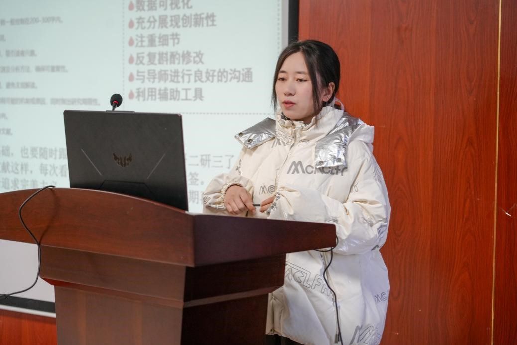 在活动中,徐璐结合自己的个人经历,分享了她在研究生阶段如何确定学习动机、进行科研规划以及合理安排课余活动的经验。随后,刘莎详细讲解了科研过程中常见的文献阅读、实验操作、开题报告撰写、软件使用以及论文写作等技巧。她特别分享了自己在撰写综述文章方面的经验,并强调了在科研过程中如何有效整合信息和提高写作质量的重要性。