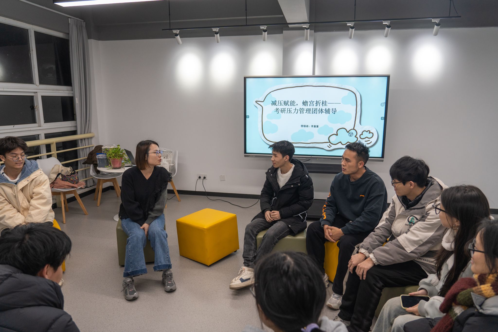 本次团体辅导是76net必赢线路检测中心、莳心工作室开展毕业生心理健康教育的重要内容,旨在引导学生有效调整考研压力,帮助学生调解情绪、舒缓压力,在不断努力奋斗的青春实践中实现人生梦想。