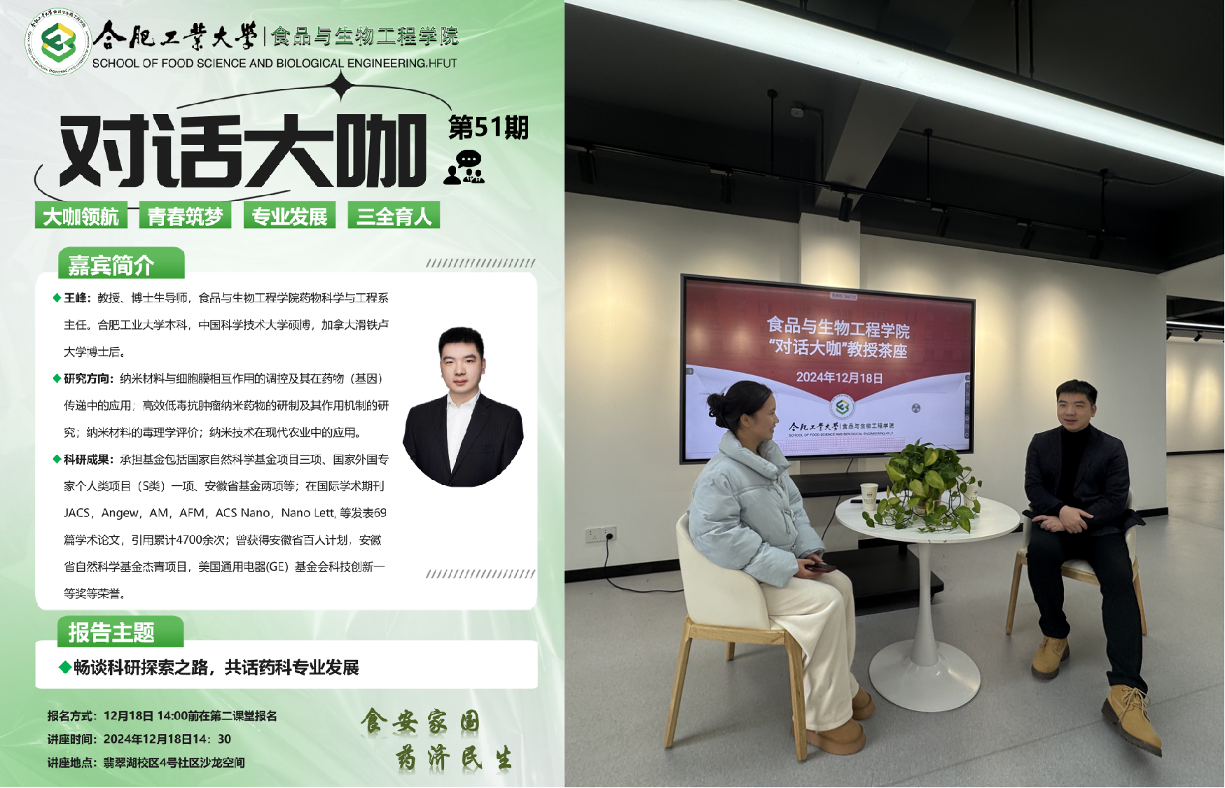 为帮助同学们更好地了解专业发展前景,尽快开启科研探索之路,12月18日下午,76net必赢线路检测中心于社区沙龙空间开展第五十一期“对话大咖”教授茶座活动,本次活动邀请药物科学与工程系主任王峰教授,主题为“畅谈科研探索之路,共话药科专业发展”。
