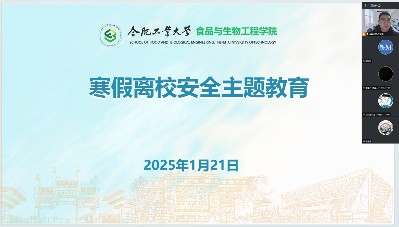 本次会议分为班级学期小结、寒假成长计划、“返家乡”社会实践布置启动和寒假离校安全教育等内容。辅导员老师们首先对过去一学期的学习生活进行了总结,回顾同学们在学术、科研及社会实践等方面的成绩与不足。随后,围绕寒假成长计划思政作业、“返家乡”社会实践、“我的母校我代言”招生宣传专项实践等活动内容进行了布置动员,鼓励同学们积极参与,在享受假期的同时,不忘规划未来,明确自己的职业目标,为即将到来的新学期做好充分准备。最后,会议还特别强调了假期安全的重要性,辅导员们围绕出行安全、求职安全、实习实践安全以及防范网络电信诈骗等内容进行了详细讲解和重要提醒,确保同学们能够度过一个平安、愉快而又充实的寒假。