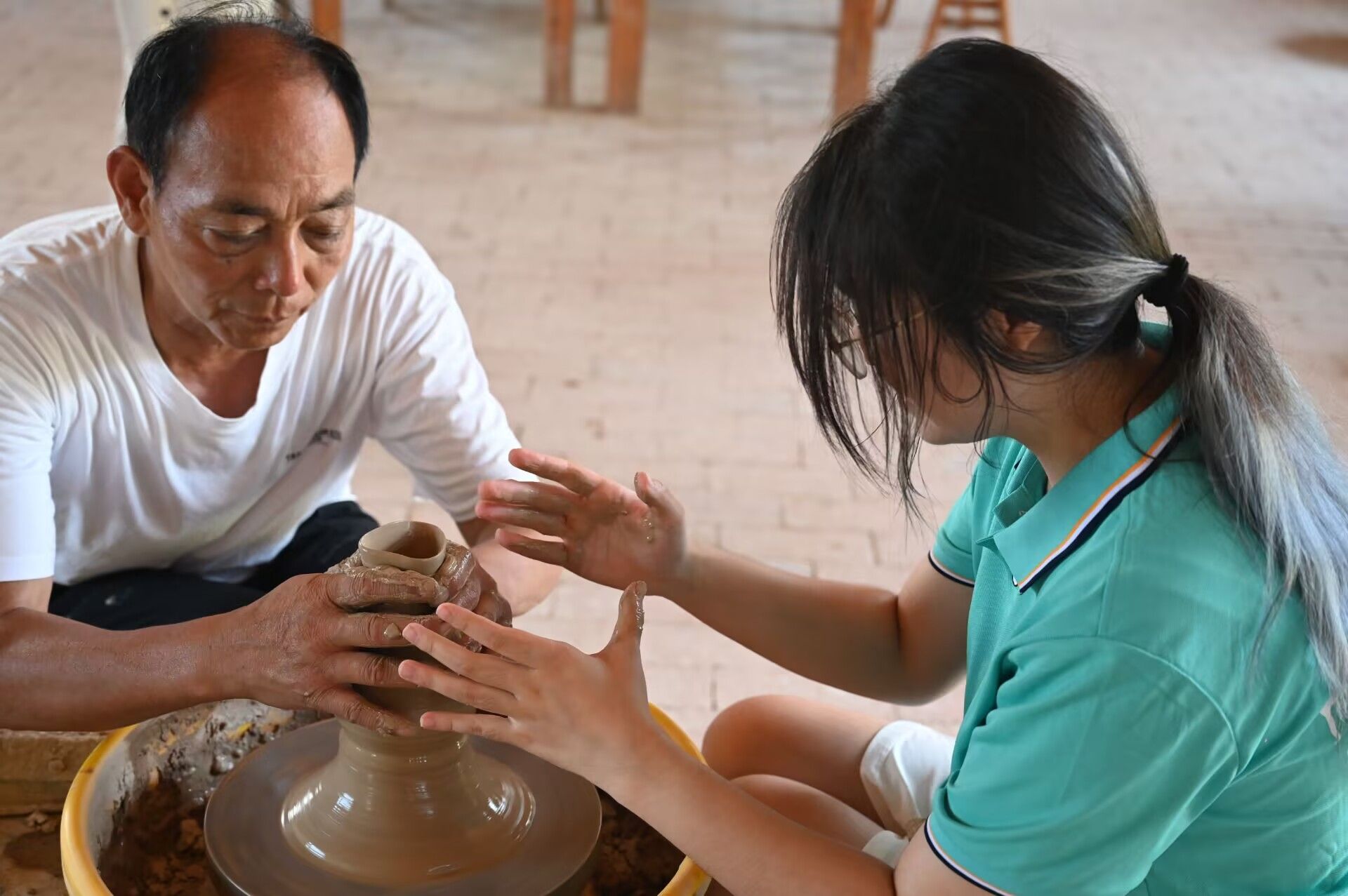 在非遗传承人黄成红师傅和涂胜友师傅的悉心指导下,团队成员开启陶艺制作初体验。从揉泥时感受陶泥在掌心变得紧实均匀,到拉坯过程中克服陶泥打滑、歪斜等难题,用稳腕匀力塑造出杯身碗口,再到塑形阶段以竹刀木片雕刻花纹、融入创意元素。尽管手法生涩,但每一次与泥土的亲密接触、每一个创作细节,都让大家深刻领略到传统手工艺的精妙,是一次向传统文化和匠心精神的致敬。