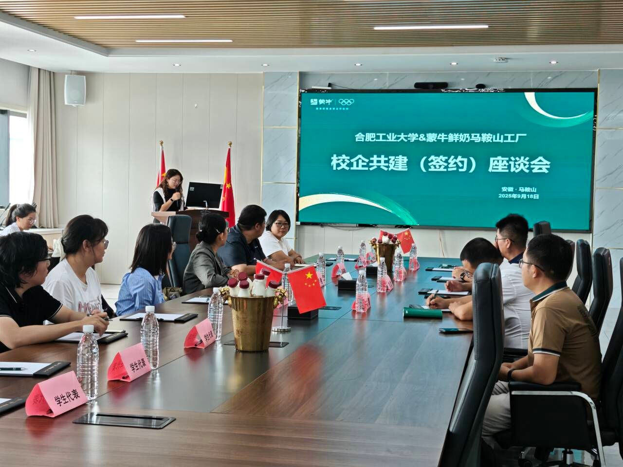 上午,师生一行与蒙牛乳业(马鞍山)有限公司相关负责人开展校企合作座谈会。首先,蒙牛乳业(马鞍山)有限公司鲜奶人事行政经理王丽娜介绍了企业规模、产品种类、企业文化、招聘需求等相关情况。接着,李艳从必赢概况、学科专业、人才培养、科学研究、就业情况等方面介绍学院情况。随后,蒙牛鲜奶马鞍山工厂厂长刘旋代表企业与学院签订《大学生就业实习基地协议书》,并举行授牌仪式。最后,校企双方在就业实习、企业参观、产学研合作等方面达成一致意见,现场学生就自己关心的问题,与企业相关负责人进行交流。最后,在厂长刘旋、运营经理刘岭、运营经理彭鹏的陪同下,师生一同参观了生产车间和党建馆,并达成了党支部共建的共识。通过座谈和参观,学生对企业有了深入的了解,毕业班同学现场投递简历。