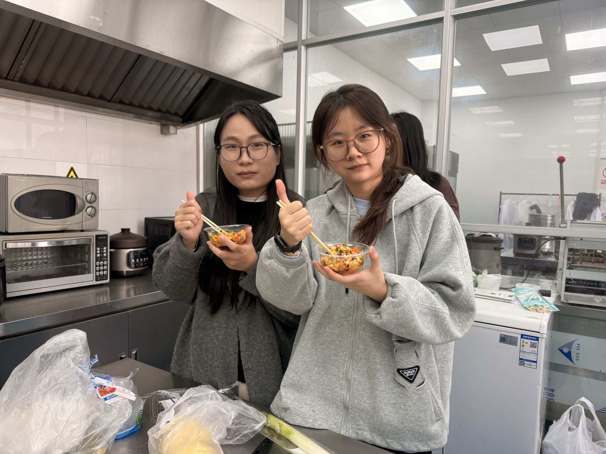 活动当天,实验室里暖意盎然,同学们热情高涨,自由组队后迅速投入美食创作。在蛋炒饭制作区,各小组的同学大展身手:将米饭打散确保粒粒分明,热油下锅后快速翻炒鸡蛋至金黄蓬松,再加入切配好的胡萝卜丁、火腿丁翻炒出香,最后倒入米饭大火快炒,撒上盐、胡椒粉等调料调味。随着铲子的起落,米饭在锅中跳跃,香气四溢,一碗碗色泽鲜亮、咸香可口的蛋炒饭陆续出锅,尽显中式烹饪的火候掌控之道。