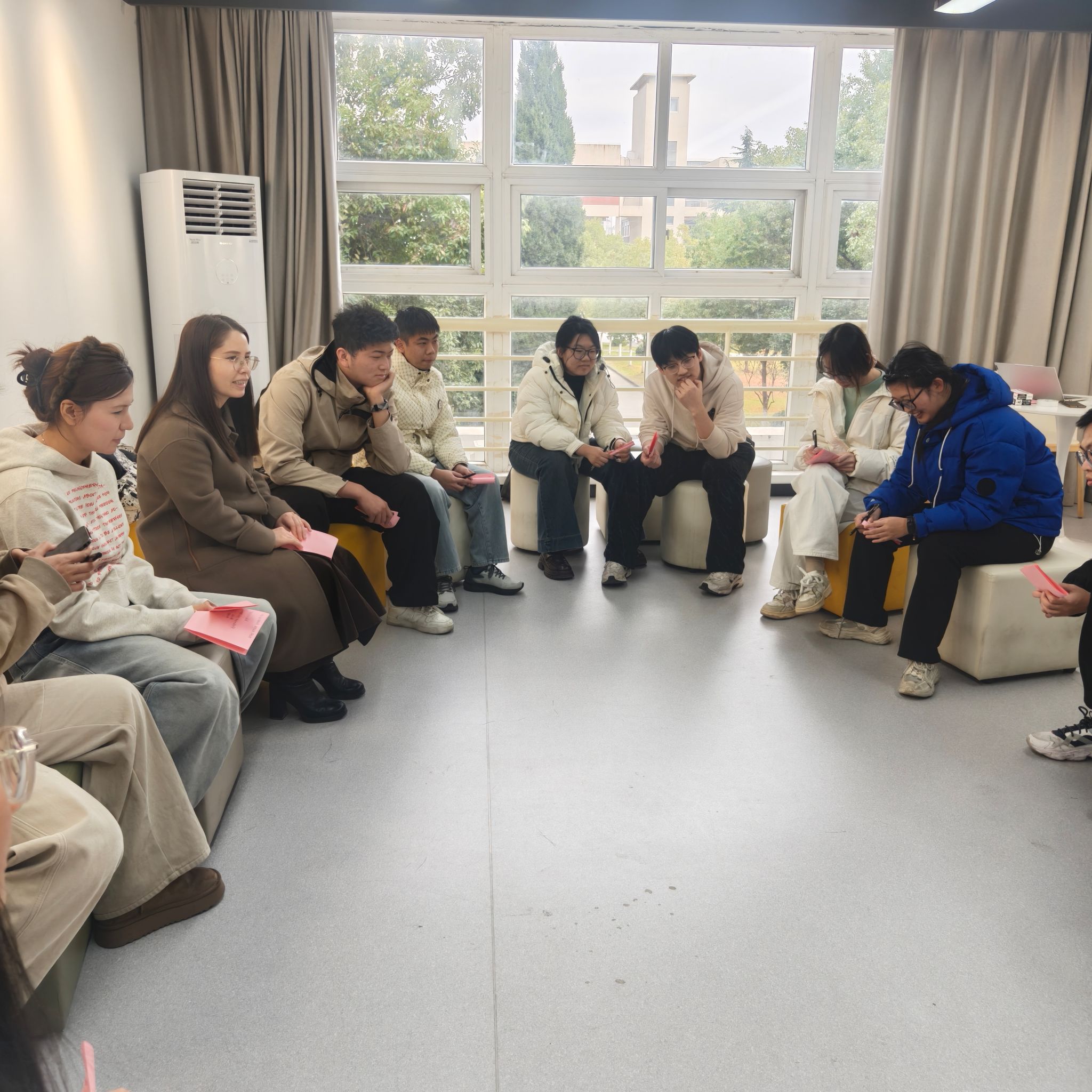 在核心辅导阶段,活动围绕“压力疏解与心态建设”展开,通过多元化形式帮助同学们直面考研压力:一是正念冥想环节,在舒缓的音乐与引导语中,同学们闭眼放松、专注呼吸,逐步释放身心紧绷感;二是考研心理描述分享,大家结合自身经历,坦诚交流备考中的焦虑、迷茫与坚持,在共鸣中获得情感支持;三是“压力背包”互动,同学们以书写卡片的形式梳理压力来源,再通过“放下背包”的象征性动作,与压力和解;四是考研压力应对方法分享,努尔比耶姆引导同学们也积极分享各自的减压小妙招,形成“经验互助”的良好氛围;最后以“能量传递球”收尾,大家围坐成圈传递彩球,每传递一次便说出一句鼓励的话,将积极心态与温暖力量传递给身边伙伴。整场活动中,欢声笑语不断,同学们在互动中释放紧张情绪,在交流中坚定备考信心。