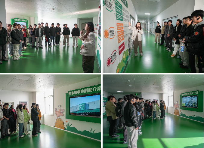 老乡鸡中央厨房人力行政科负责人李蕾钦热情接待师生一行,详细讲解了企业“从养殖到餐桌”的全产业链布局,以及“品质第一,顾客至上,员工为大”的经营理念。师生们先后参观企业文化长廊与现代化中央厨房,透过玻璃幕墙近距离观摩全自动化生产流程,每一个环节都让大家真切感受到食品工业的干净卫生和标准化管控。在物流中心内,全国门店销售热力图、生产线运转效率、冷链配送轨迹等实时数据清晰呈现,直观展现了科技对传统餐饮产业的赋能价值。