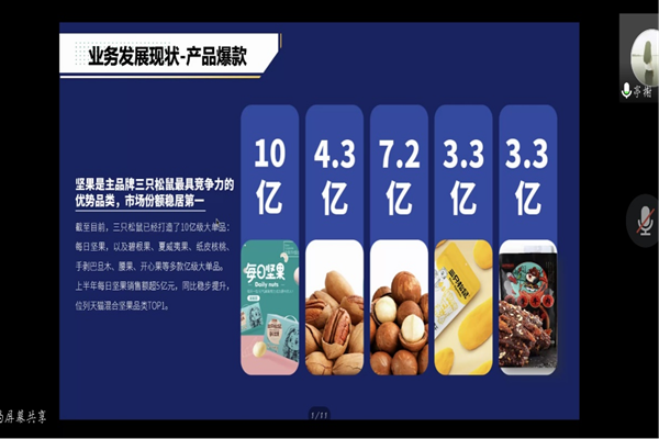 然后,三只松鼠股份有限公司谢婷婷经理为大家分享三只松鼠股份有限公司的企业文化、业务发展现状和创新核心,并以风味薯条和甜辣鸭脖为案例,向同学们详细介绍了三只松鼠产品的“创意-实验小试-工厂中试-工厂大试及生产”研发上市流程。最后,她还向同学们分享了个人在职场上的心得,希望同学们在工作中可以做到谦虚务实和乐于学习。