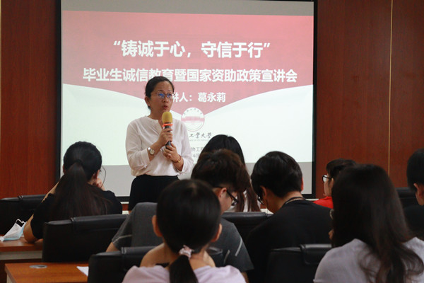 6月9日上午,76net必赢线路检测中心举办了“铸诚于心,守信于行”毕业生诚信教育暨国家资助政策宣讲会,学院党委副书记兼纪委书记李艳、资助专管员葛永莉和贷款毕业生近80人参加了此次活动。