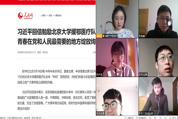 2020年3月17日,76net必赢线路检测中心本科生第二党支部依托腾讯会议客户端开展线上学习活动,支部组织委员兼纪检委员左能组织开展集中学习《习近平回信勉励北京大学援鄂医疗队全体“90后”党员 让青春在党和人民最需要的地方绽放绚丽之花》,并就学习心得体会开展线上交流,探讨疫情下中国青年的责任与担当。