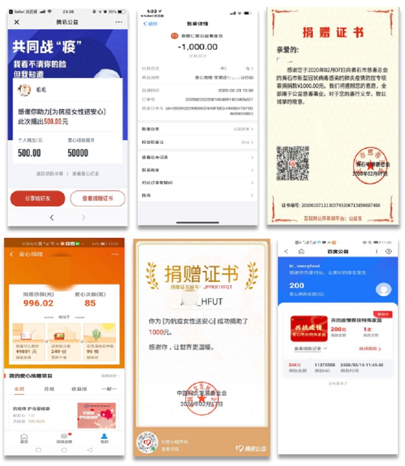 近日,全院全体党员正积极响应校党委号召,一天时间迅速完成为支持新冠肺炎疫情防控工作捐款。此次集中捐款共收到全体党员捐款52150.16 元,非党员捐款12181.00元,为打赢疫情防控人民战争、总体战、阻击战贡献力量。“感谢您向武汉市慈善总会的新型冠状病毒防控专项基金捐款3000元。我们将遵照您的意愿,全部用于公益慈善事业”“感谢您向黄石市慈善总会的黄石市新型冠状病毒感染的肺炎疫情防控专项募捐捐款1000元。对于您的善行义举,致以诚挚的敬意”……这是学院党员教师前期陆续收到的社会捐款反馈。疫情无情人有情,小小善举暖人心!学院师生中涌现出越来越多的爱心践行者,他们发扬无私奉献精神,通过腾讯公益、百度公益、公益宝、支付宝爱心捐赠等互联网公开募捐平台,向疫情灾区和医务工作者捐款和N95口罩等防护用品,持续为武汉加油,为中国加油。