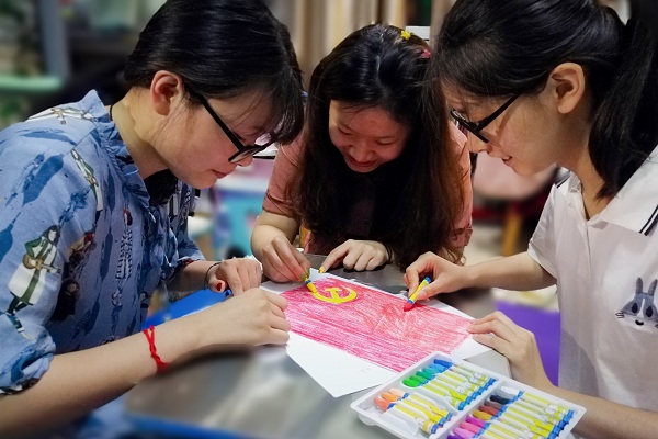 学生党员手绘党旗与党旗合影