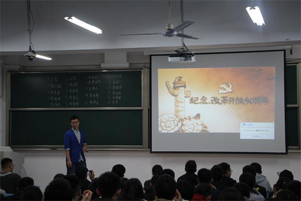 参赛同学结合PPT进行演讲,同学们从自身角度阐述了对改革开放的认识和理解,讲述了改革开放四十年来国家经济的腾飞,军事实力的增强,新四大发明的出现及应用,有的同学以家乡的变化为例,展示了改革开放四十年家乡人民在衣食住行等方面的巨大变化,讲述了自己对改革开放的展望以及美好祝愿,有的同学以改革开放的成果为例,结合当下我国的国内外形势,分析阐释了新时代青年应担负的重大使命。