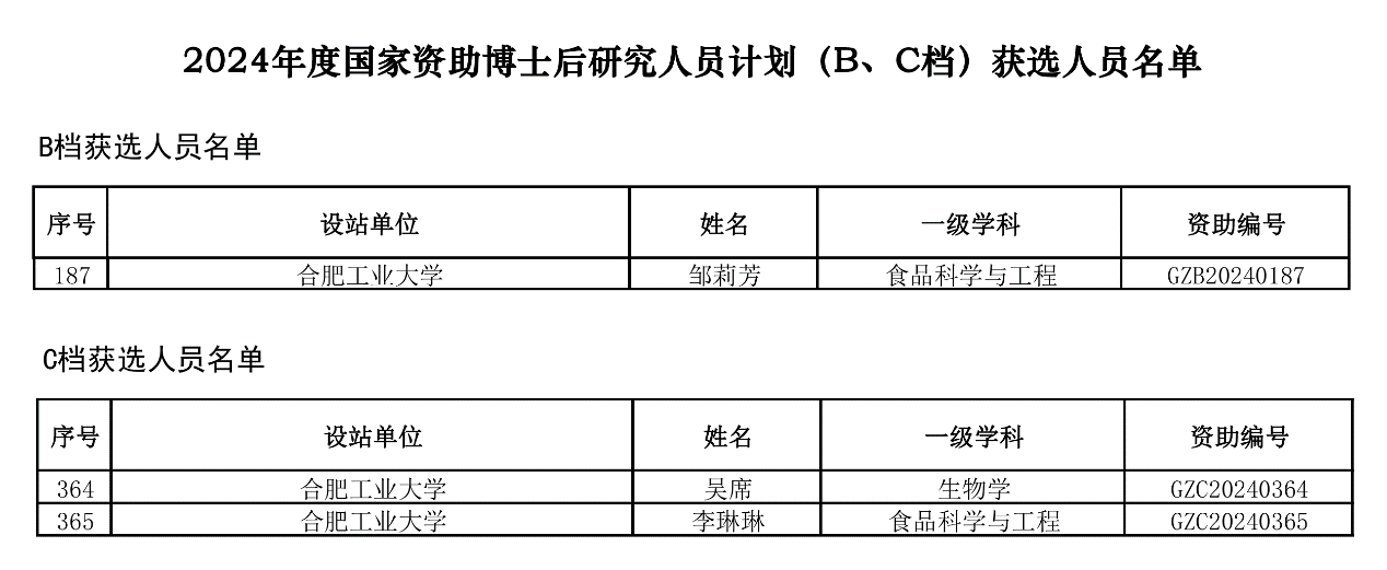 近日,全国博士后管委会办公室、中国博士后科学基金会公布了《关于印发2024年度国家资助博士后研究人员计划(B、C档)获选结果的通知》(博管办〔2024〕90号),学院博士后邹莉芳(合作导师:徐宝才 研究员)获批B档资助,李琳琳(合作导师:徐宝才 研究员)、吴席(合作导师:曹树青 教授)两位博士后获批C档资助。B档资助标准为18万元/年,C档资助标准为12万元/年,资助期均为2年。