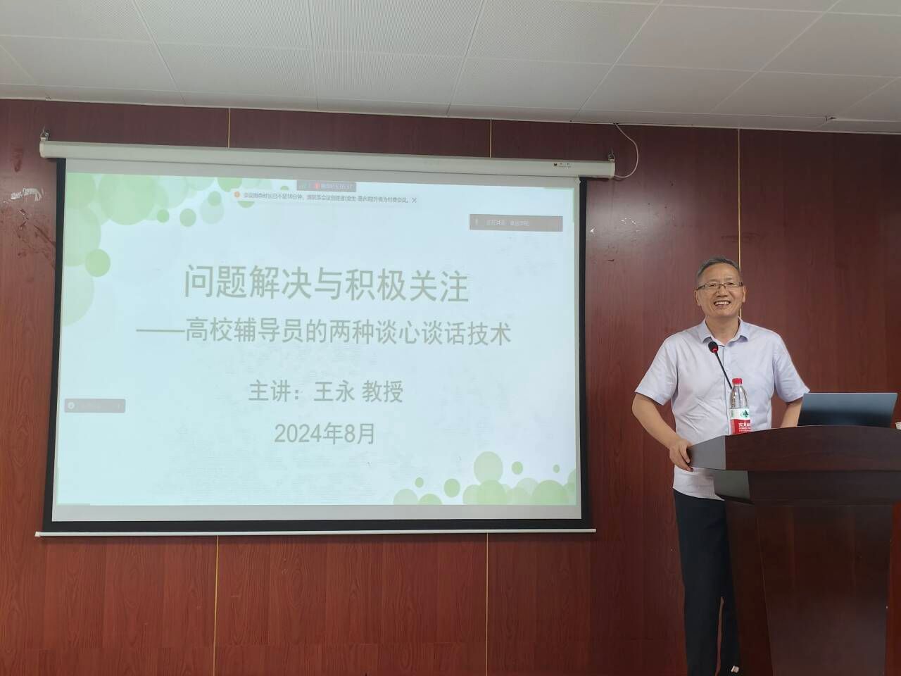 班主任聘用仪式结束后,学院依托学院莳心工作室,邀请合肥幼儿师范高等专科学校王永教授作“如何面向学生开展谈心谈话”心理培训讲座。王永教授结合多个案例,从大学生心理发展健康水平评估、谈心谈话的两种取向等方面阐述了谈心谈话的艺术与技巧,并提出相关建议,在积极关注中促进学生持续发展。班主任、导师们认真参与培训,积极进行互动,通过交流和研讨,大家相互学习、相互启发,共同探讨了心理健康教育的有效方法和途径。