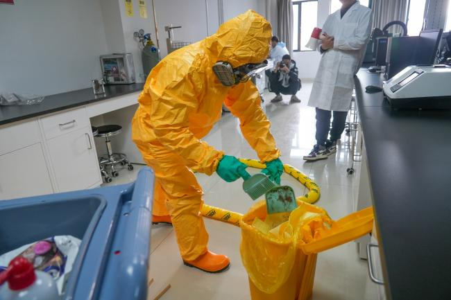 20日上午,实验室安全知识及应急(演练)培训会于科教楼A座二楼报告厅举行。副院长李沛军强调了实验室安全工作的极端重要性,要求学院广大师生借助此次培训演练活动,进一步提升实验室安全意识、安全知识和应急能力。上海联盈实验室装备集团有限公司董事长南品磊受邀进行安全知识培训,他从实验室安全意识、实验室装备、实验室个人防护等几个方面进行了宣讲。培训现场气氛热烈,学院师生200余人积极踊跃参与,认真聆听。下午开展的安全演练实战环节,模拟演练了实验室学生在实验操作中不慎造成浓盐酸溢洒事故及其应急处置流程。演练中安全专家详细讲解了安全事故应急处理的关键步骤,同学们迅速准确、有条不紊地采取自救和互救措施,顺利完成安全事故应急处置。