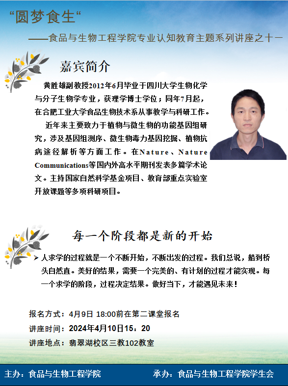 黄胜雄副教授2012年6月毕业于四川大学生物化学与分子生物学专业,获理学博士学位;同年7月起,在bwin必赢线路检测食品生物技术系从事教学与科研工作。