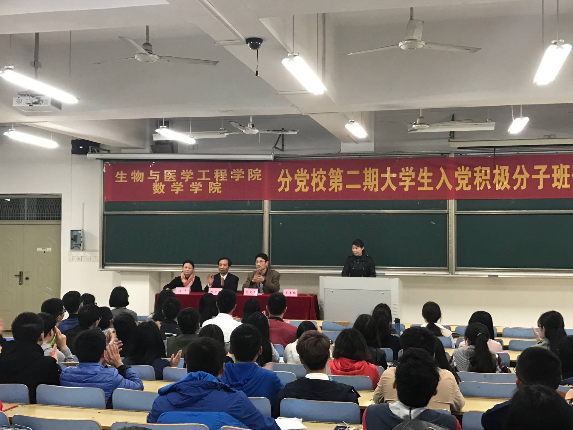 4月7日晚, 三教102教室掌声阵阵,生物与医学工程学院和数学学院第二期大学生入党积极分子班在此举行。校党委组织部和相关学院负责人出席开班典礼。整场典礼以铿锵有力,激动人心的《义勇军进行曲》拉开序幕。