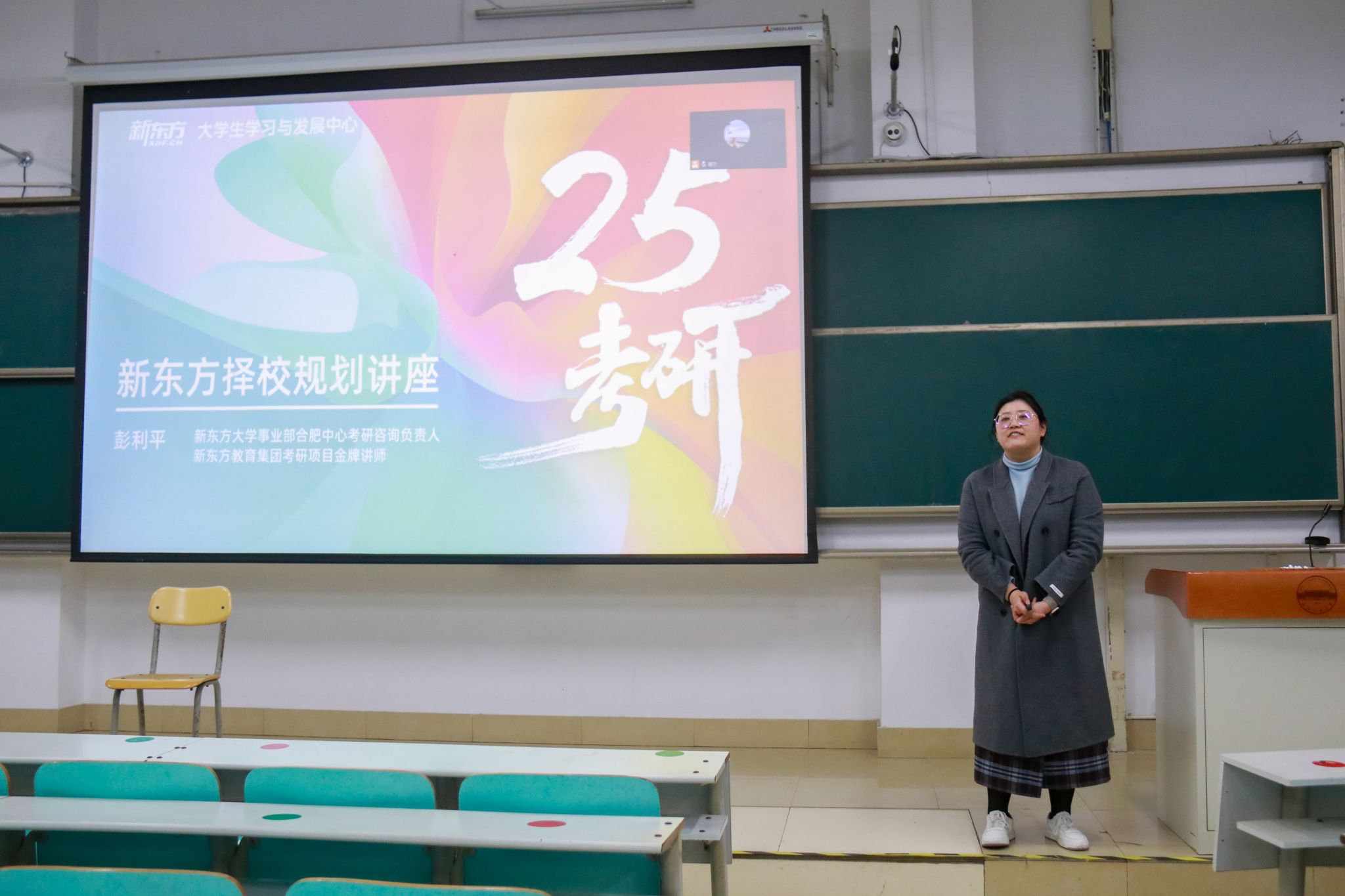 12月8日晚,76net必赢线路检测中心在翠一教102举办第三十一期“走向职场,走向未来”职商讲堂。新东方教育集团考研项目部全国巡讲师彭利平应邀担任主讲。活动由辅导员努尔比耶姆老师主持,学院合肥校区2021级本科生200余人线下参加,宣城校区共有100余人线上参加。
