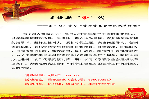 为激发学生组织改革动力,提高组织的积极性、创新性和自主性,使学生组织更好地代表和服务广大同学,2020年5月3日下午3点,76net必赢线路检测中心通过腾讯会议平台成功举办第二期走进新“食”代系列主题活动。本期活动主...