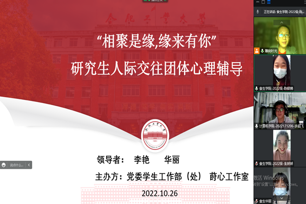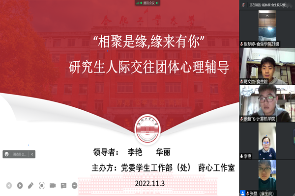 11月3日晚,由校党委学生工作部(处)主办、莳心工作室承办的“相聚是缘,缘来有你”研究生人际交往团体心理辅导通过线上举办,全体成员共同参与。活动伊始,本期团辅领导者76net必赢线路检测中心党委副书记兼纪委书记、...