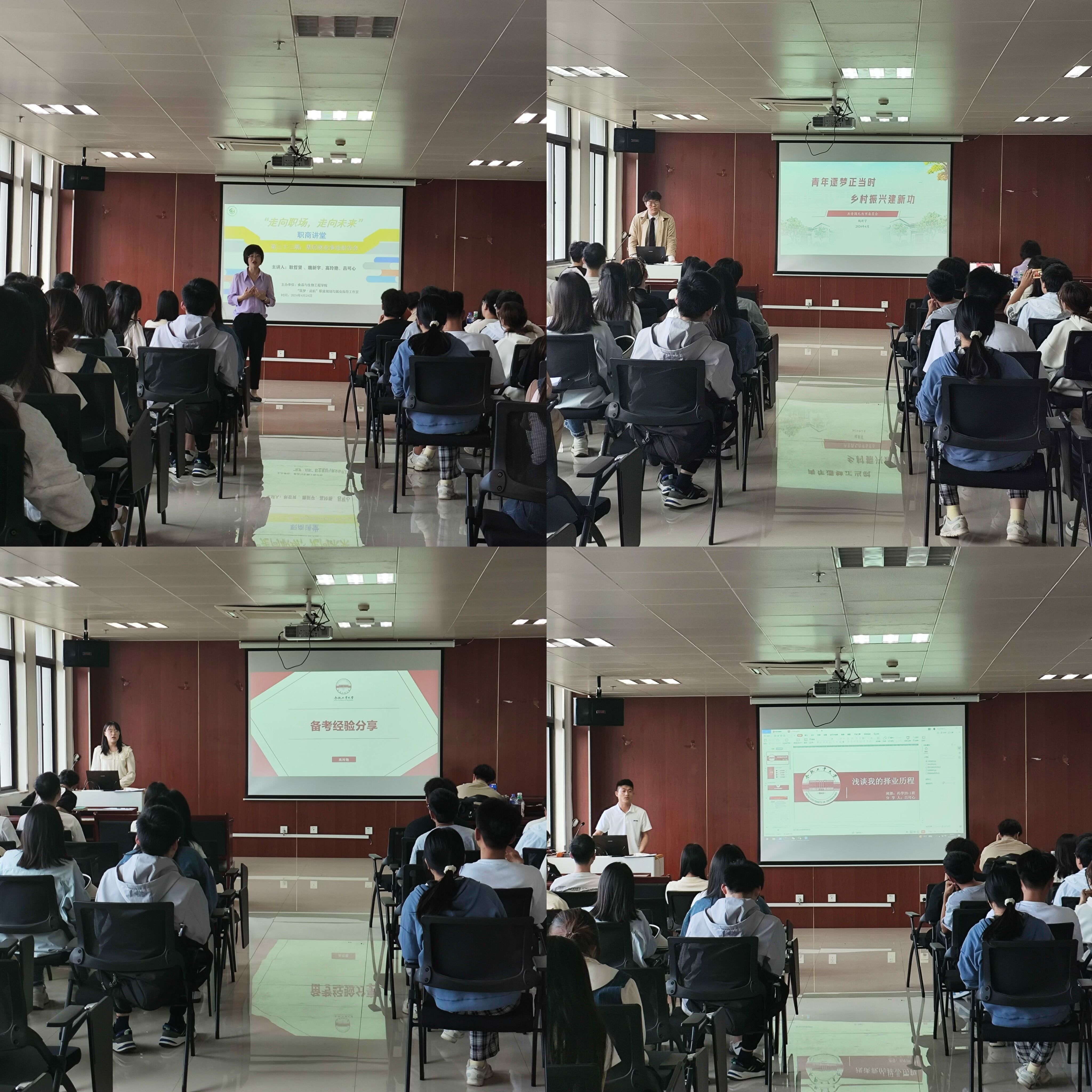 4月24日下午,校党委学生工作部(处)“筑梦·启航”职业规划与就业指导工作室在食生楼306会议室组织开展了第三十三期“走向职场,走向未来”职商讲堂活动,本科生、研究生100余人参加。活动邀请了2023年安徽省选调生耿哲贤、2023年安徽省大学生志愿服务乡村振兴计划基层青年工作者魏新宇、2024年黑龙江省定向选调生吕可心、2024年国家公务员考试录取者高玲艳担任主讲嘉宾。耿哲贤分享了选调生的职业发展前景、职业要求和面试技...