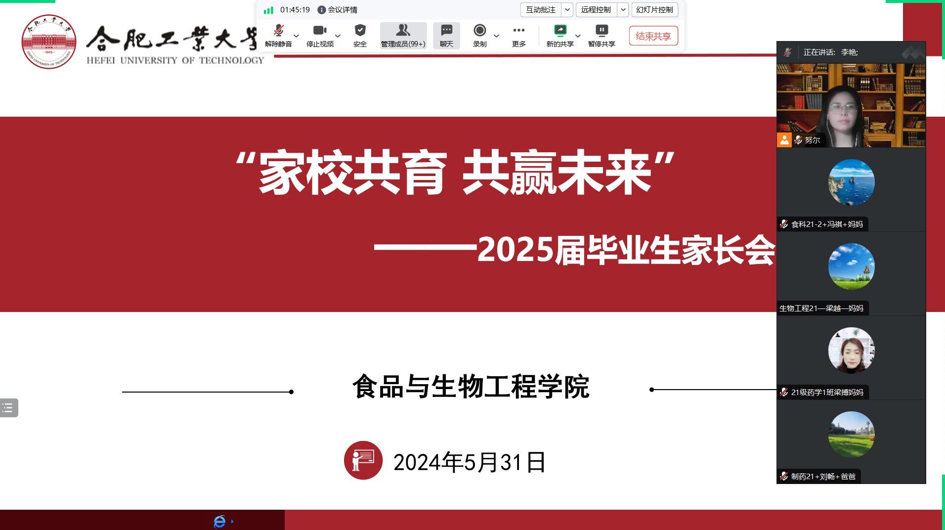 5月31日晚,76net必赢线路检测中心通过腾讯会议召开以“家校共育,共赢未来”为主题的2025届毕业生线上家长会,学院党委副书记兼纪委书记李艳、2021级辅导员努尔比耶姆及200余名学生家长参加了本次会议。努尔比耶姆首先介绍了2025届毕业生的整体情况,并结合就业摸底数据对同学们的未来发展意向、毕业学分要求等情况进行了说明。紧接着,会议主要围绕当前就业/升学形势、就业重要窗口期、多元的就业形式、毕业生参军入伍政策和家长...
